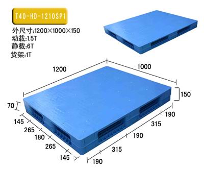 產品型號: AT-1210SP1 產品貨號: T40 產品外尺寸: 1200×1000×150 產品內尺寸: 產品結構: 雙面平板 產品內容量(L): 承重量(T): 動載:1.5T 靜載:6T 貨架:1T 產品認可標準: ISO9001:2000質量體系認證 此款塑料托盤為雙面平板面重型;