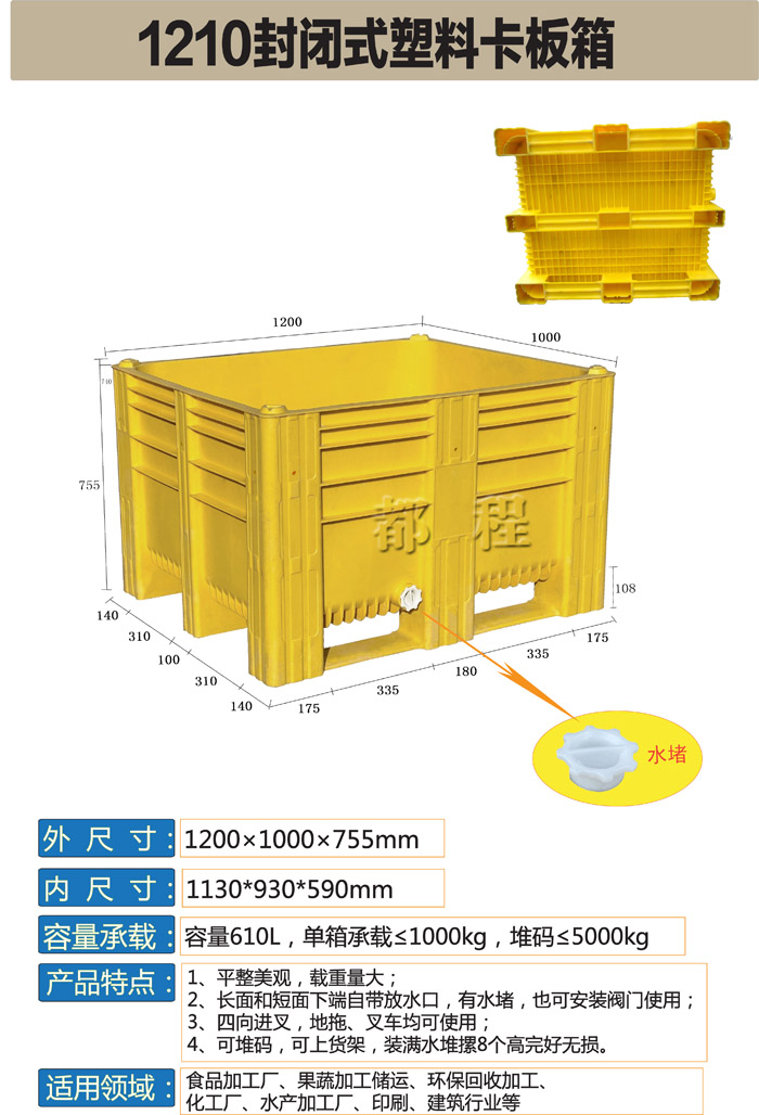編 號: 3#卡板箱 外尺寸(mm): 1200×1000×755 內(nèi)尺寸(mm): 1130*930*590 備 注: 適合食品加工、果蔬加工儲運(yùn)、環(huán)保回收加工、化工、水產(chǎn)加工、印刷、建筑等行業(yè)